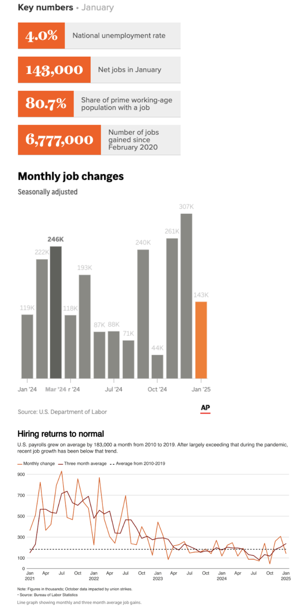 “Healthy but unspectacular” was the take on January’s jobs report, with the US adding just 143,000 jobs as unemployment fell to 4% (economists had expected closer to 170,000). The report also saw upward revisions November and December by a combined 100,000 positions. January marks the second-longest streak of jobs growth in US history, and the prime working age employment to population ratio rose to 80.7%. “A lower-than-expected January payrolls number was more than offset by upward revisions to November and December’s totals and a downtick in the unemployment rate […] Those who’d hoped for a soft report that would nudge the Fed back into rate-cutting mode didn’t get it” said Ellen Zentner, chief economic strategist at Morgan Stanley Wealth Management.