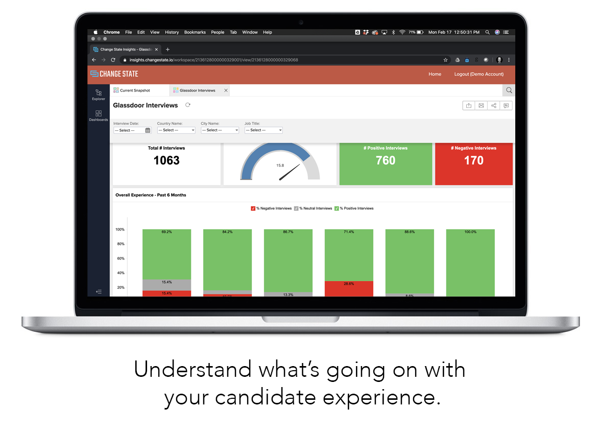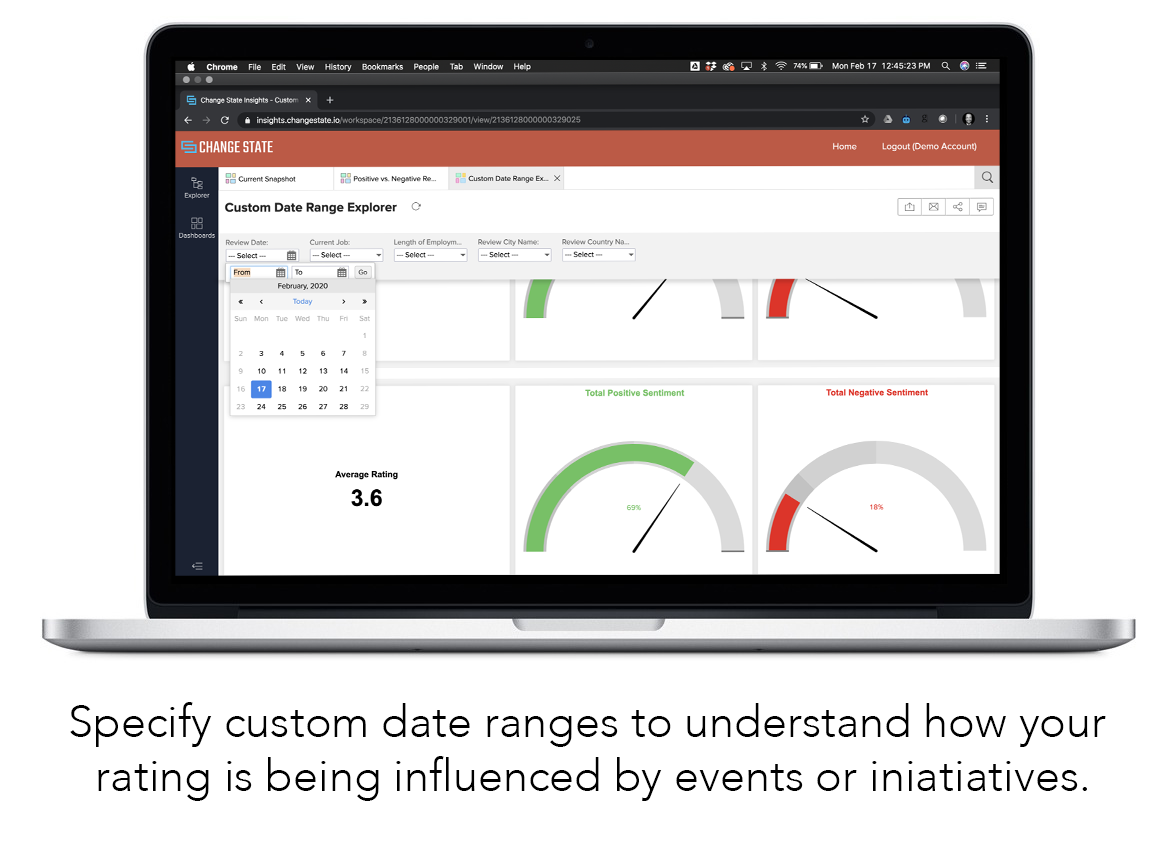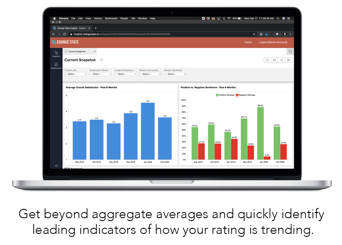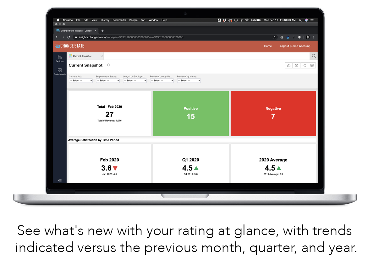 The Glassdoor Insights Dashboard simplifies the process, giving you a clear view of your rating trends across the current month, quarter, and year. With actionable insights, you can make meaningful adjustments to enhance your reputation—at the speed of your business. Take charge of your Glassdoor rating today.