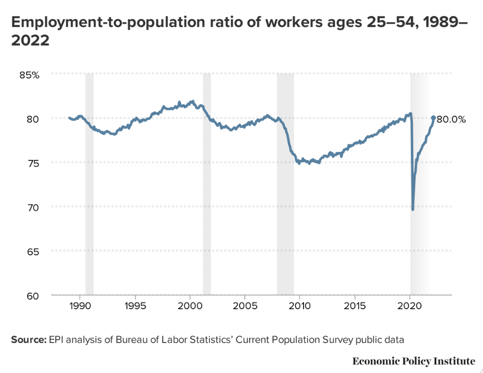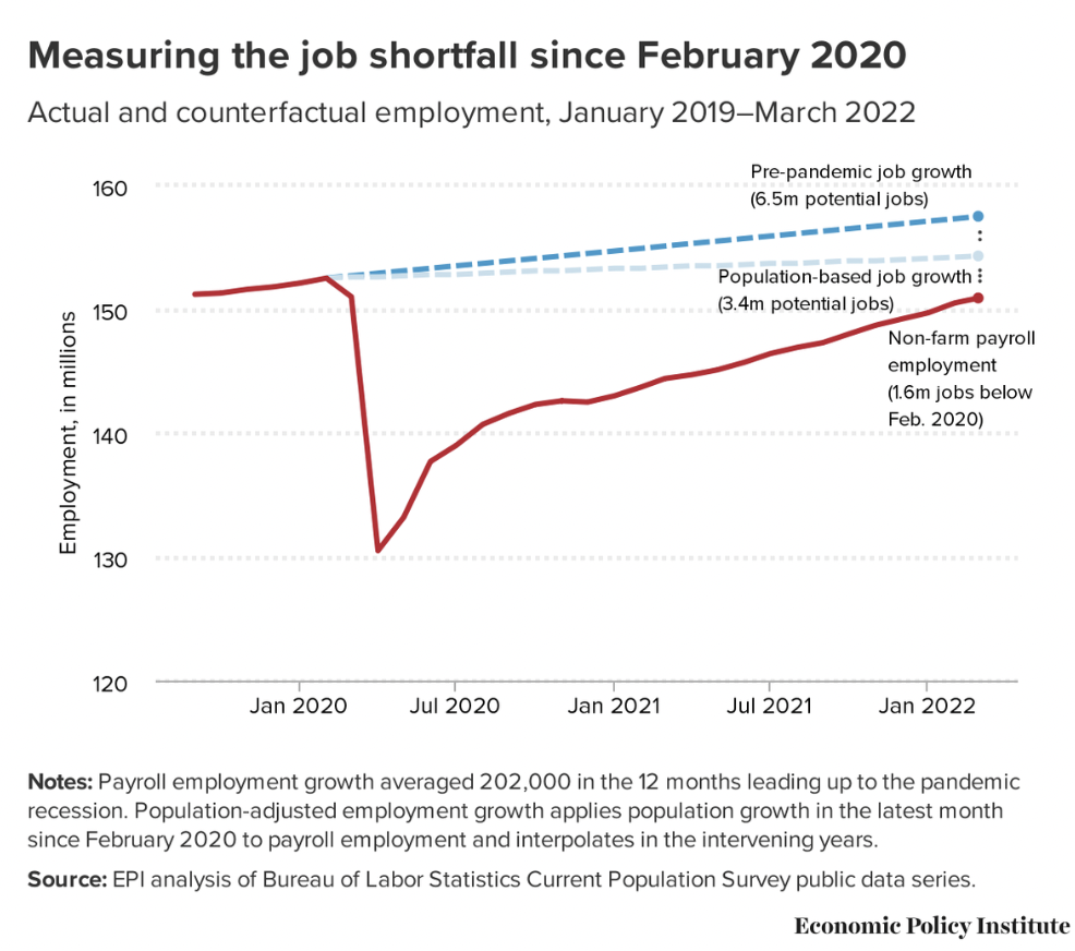 The March jobs report revealed the addition of 431,000 jobs and saw unemployment continue to fall – currently at 3.6%. Since the end of 2020, a total of 8.4 million jobs have been added to the economy. This sustained jobs growth is quite something: well over half a million jobs have been added per month on average for 15 months. While the US labor market is still 3.4 million jobs shy of pre-pandemic levels, it is well on track to hit that target before the end of 2022. This recovery is nearly 8 years faster than that of the Great Recession, and the fastest economic recovery since the 1980s.